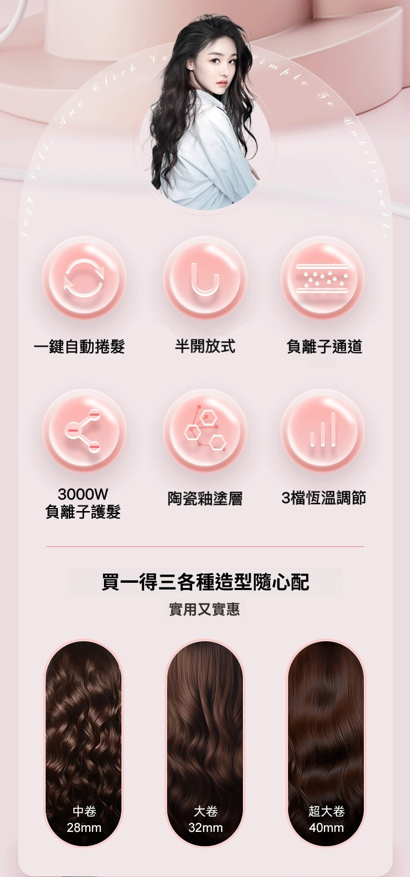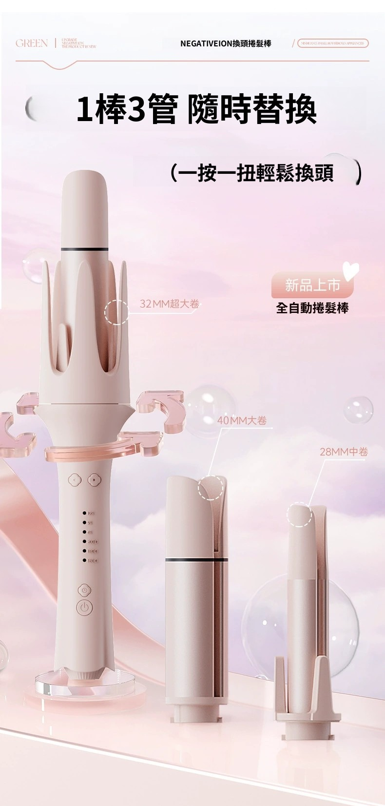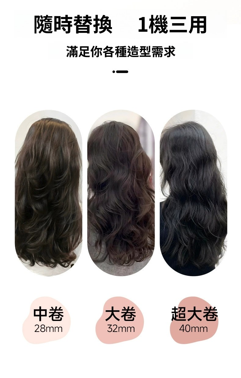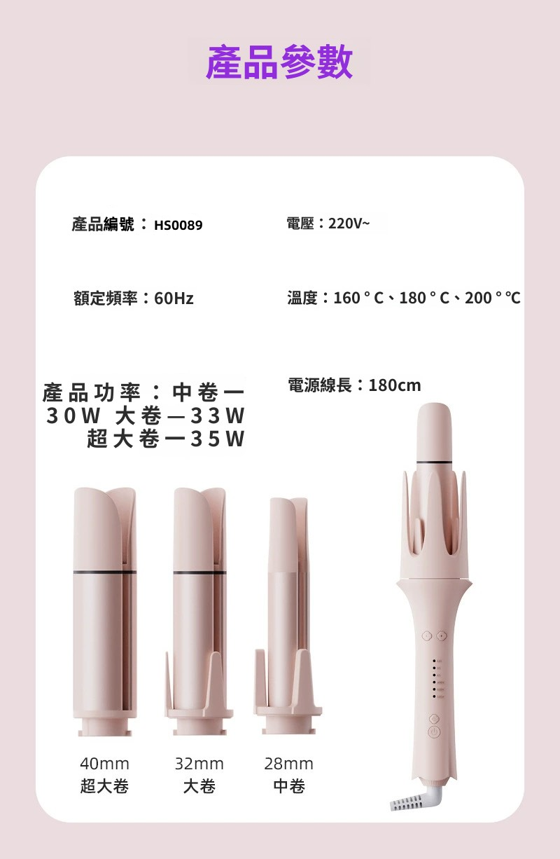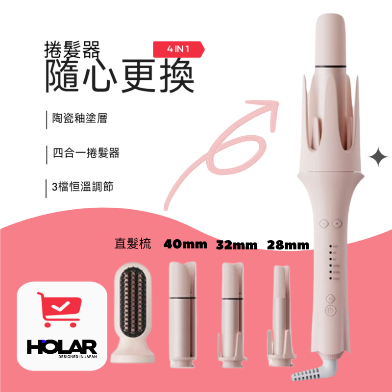 HOLAR JAPAN 四合一自動捲髮棒負離子多功能捲直髮棒大小卷不傷髮換頭捲髮器HS0089 英規香港三腳插頭 CE認證 HOLAR 4合1多功能自動捲髮棒 還在為打造多元髮型而購置一堆美髮工具嗎?這款多功能自動捲髮棒,讓你一支在手,造型無憂。 此款配備多種可替換配件:直髮梳頭,能快速拉直毛躁髮絲;40mm超大捲、32mm大卷、28mm中捲的捲發頭,滿足不同捲度需求,從自然大波浪到精緻小卷,隨心所欲切換。還有直髮梳子和無痕夾,輔助造型更輕鬆。 • 操作便利:具備一鍵自動捲髮功能,半開放式設計,更好的觀察和調整頭髮位置,避免纏繞,新手也能輕鬆上手。 • 護髮功能:負離子護髮,中和頭髮靜電,更柔順。陶瓷釉塗層,減少頭髮損傷,保護頭髮。 • 溫度調節:支援3檔恆溫調節,能根據不同髮質和造型調溫,滿足不同需求。 • 造型多元:附帶不同尺寸捲髮頭,可打造28mm中捲、32mm大捲、40mm超大捲等多種髮型 。