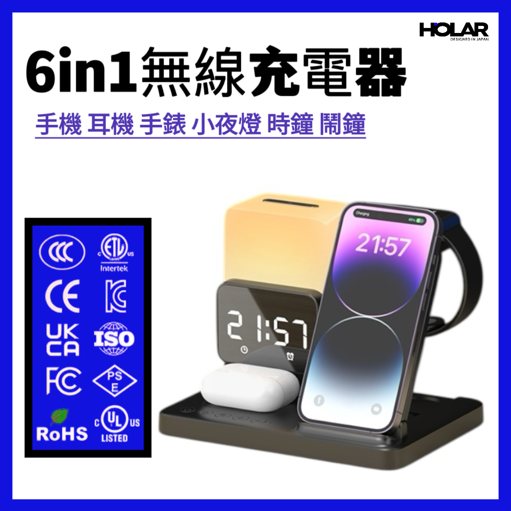 HOLAR JAPAN 6in1 摺疊款無線充電器|手錶充電器|無線充電座|夜燈款鬧鐘充電器|耳機充電器 HS0106