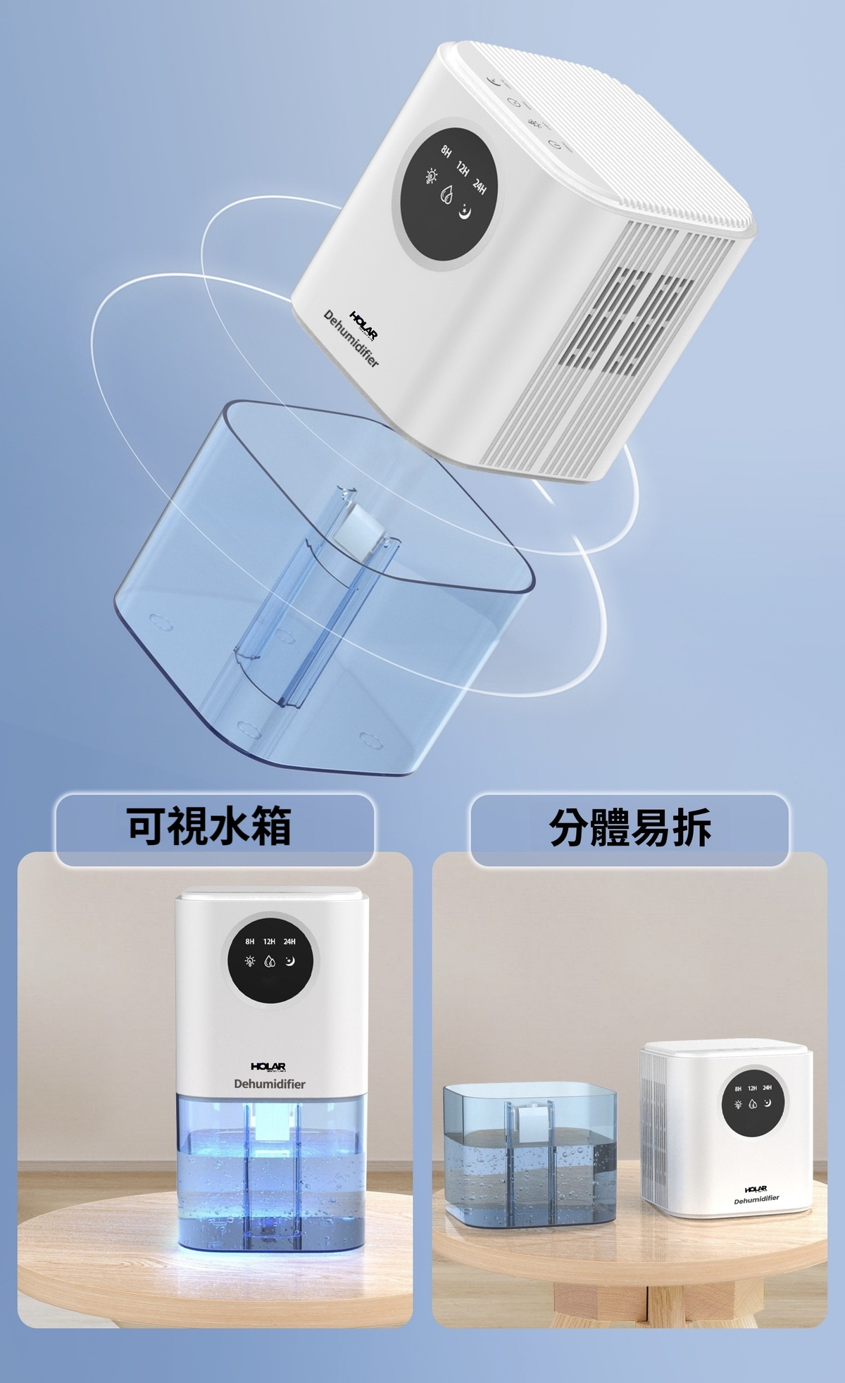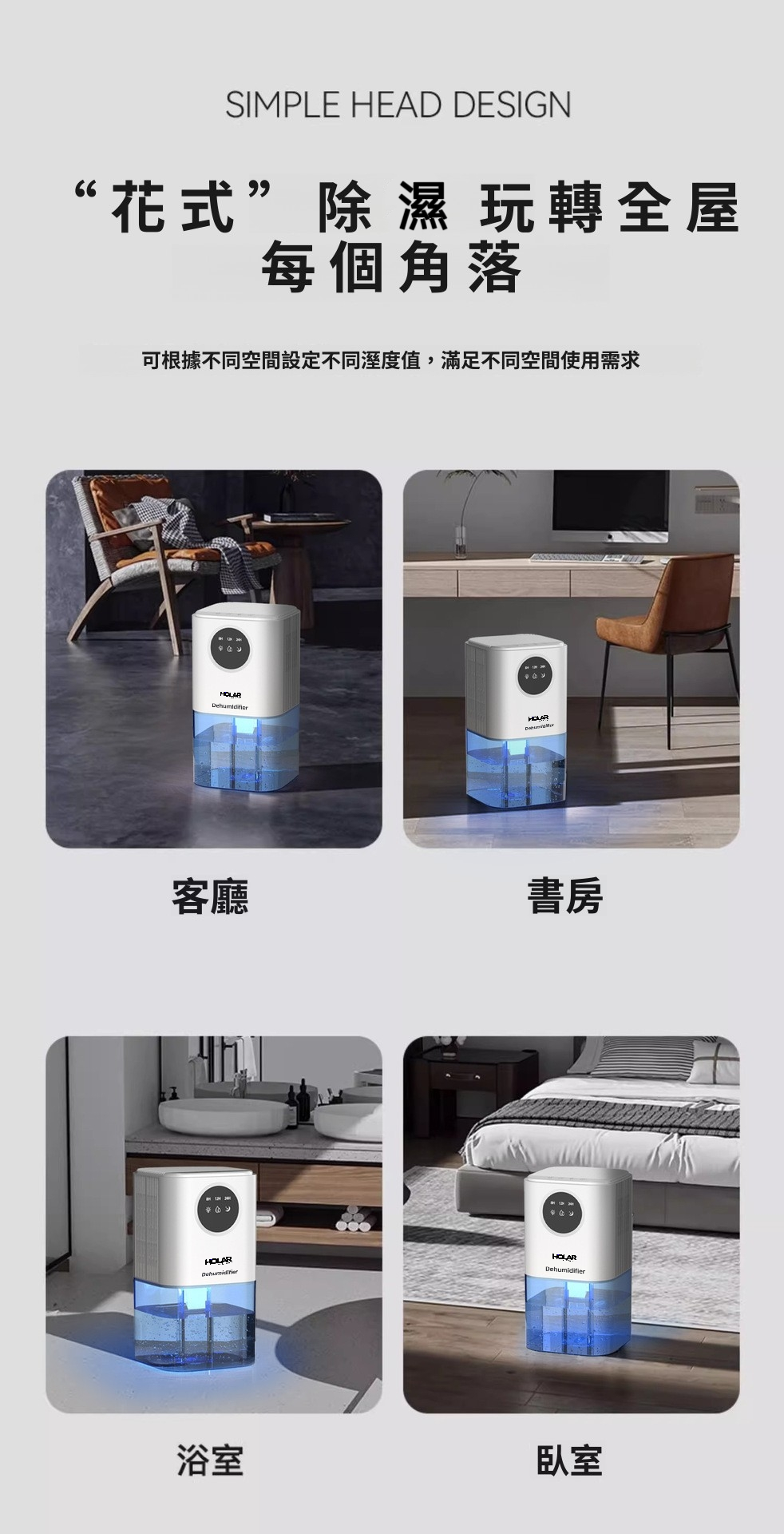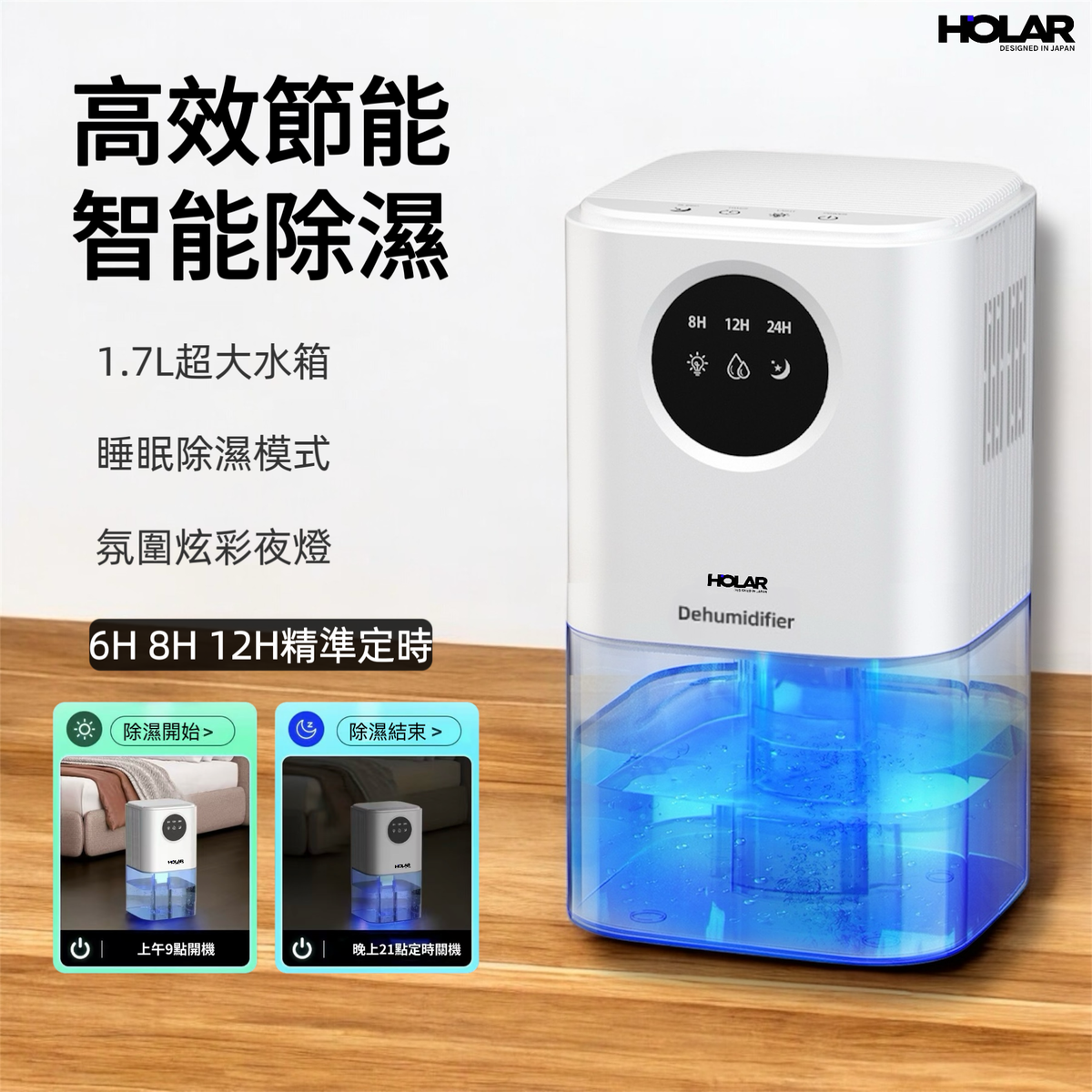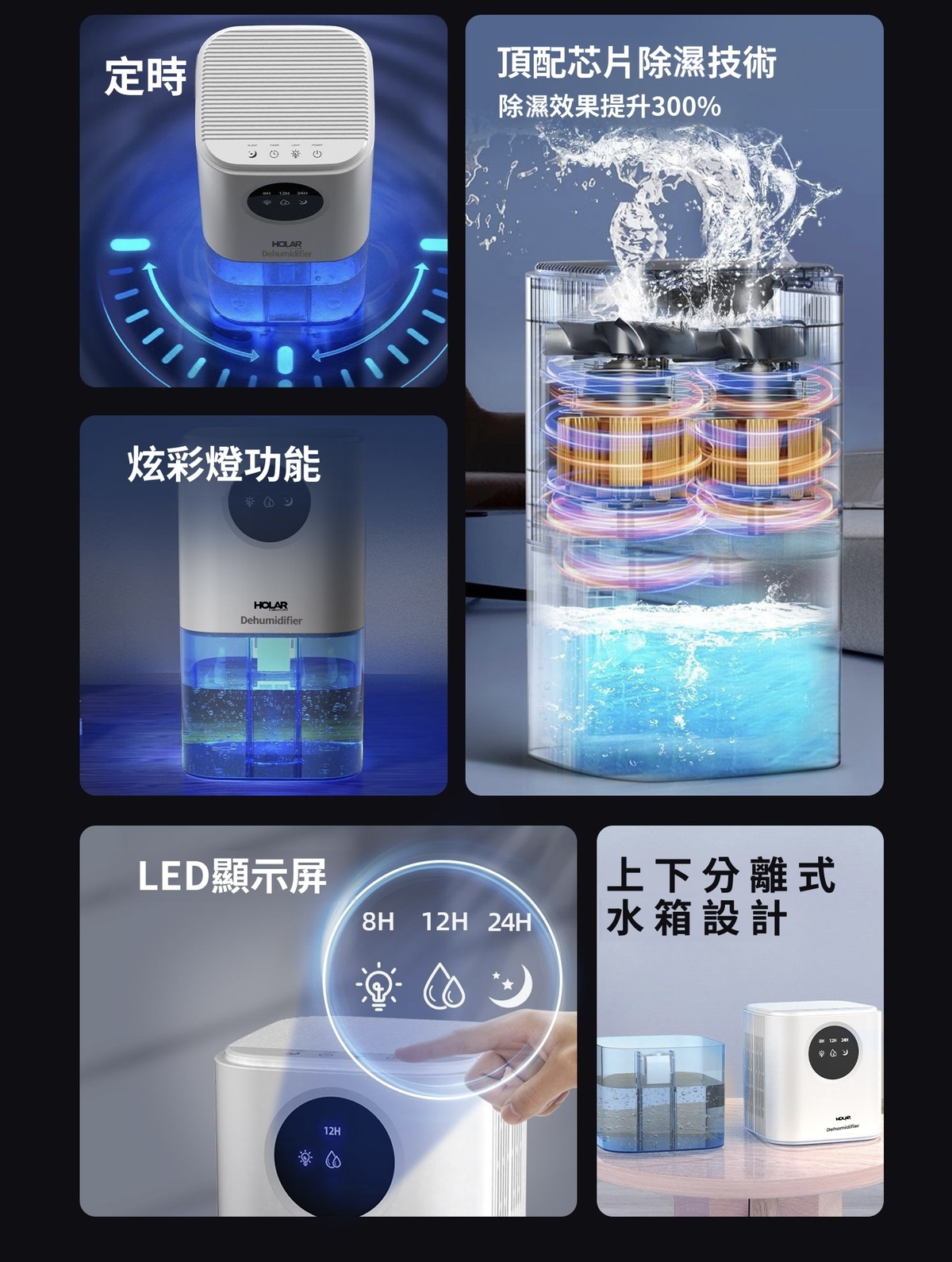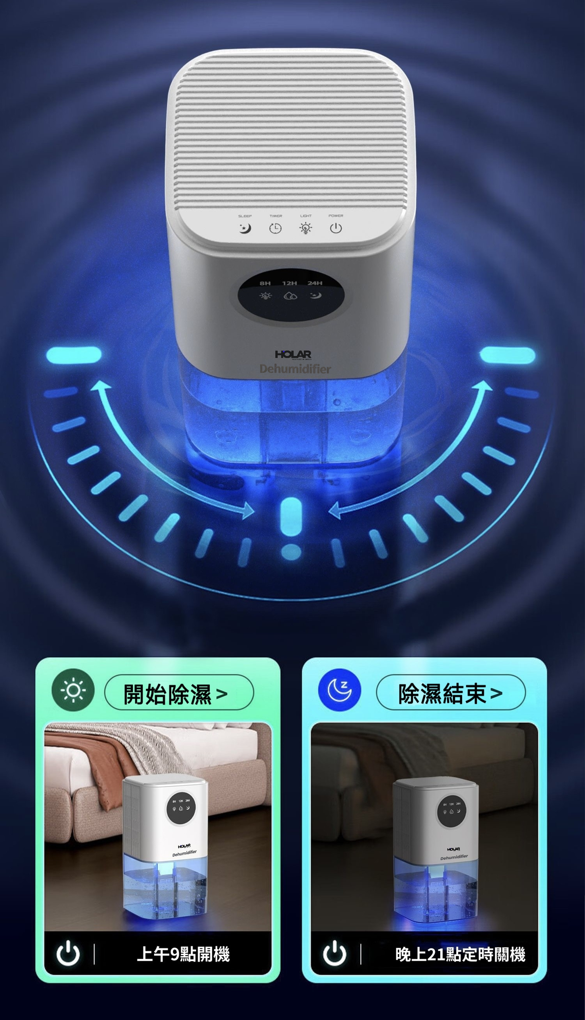 HOLAR JAPAN 智能抽濕機,結合半導體冷凝技術與人性化設計,快速去除空氣中多餘濕氣,為您打造乾爽舒適的居家環境。HS0126 產品特色: 智能數顯操控: LED屏幕清晰顯示濕度及運行狀態,操作簡單直觀。 上下分離式水箱: 水箱設計方便拆卸,輕鬆倒水不費力,清潔更便捷。 靜音低噪運行: 低噪音設計,夜間使用不影響睡眠,適合臥室、書房等安靜空間。 睡眠模式: 開啟睡眠模式,燈光自動關閉,運行更安靜,營造舒適睡眠環境。 炫彩氛圍燈光: 多色燈光可選,為您的房間增添浪漫與個性化氛圍。 24小時定時功能: 自由設定8-24小時定時開關,省電又省心。 輕巧便攜設計: 小巧機身,方便移動,適用於臥室、浴室、衣櫃、鞋櫃等多種場景。 適用場景: 臥室、客廳、書房等生活空間 浴室、廚房等高濕度區域 香港三腳認證插頭